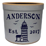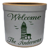 The lighthouse personalized crock is deeply etched and then hand painted. It is available in burgundy, navy, green, red and black.