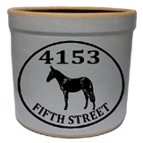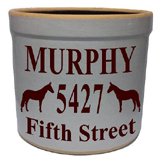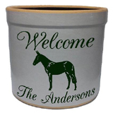 The mule personalized crock is deeply etched and then hand painted. It is available in burgundy, navy, green, red and black.