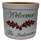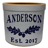 The Oakleaf personalized crock is deeply etched and then hand painted. It is available in burgundy, navy, green, red and black.