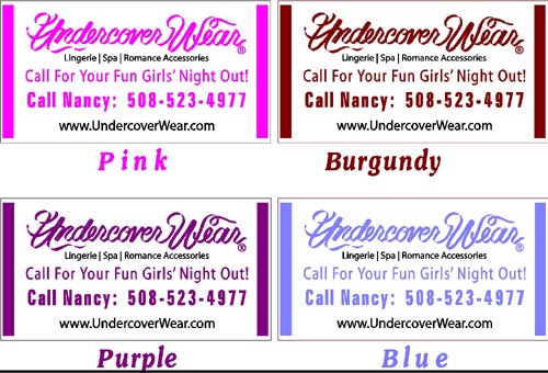 Advertise your UndercoverWear business with a vehicle magnetic sign. Each sign is personalized with your name and phone number. Available in 3 sizes, and 4 colors, sold as a pair or singularly.